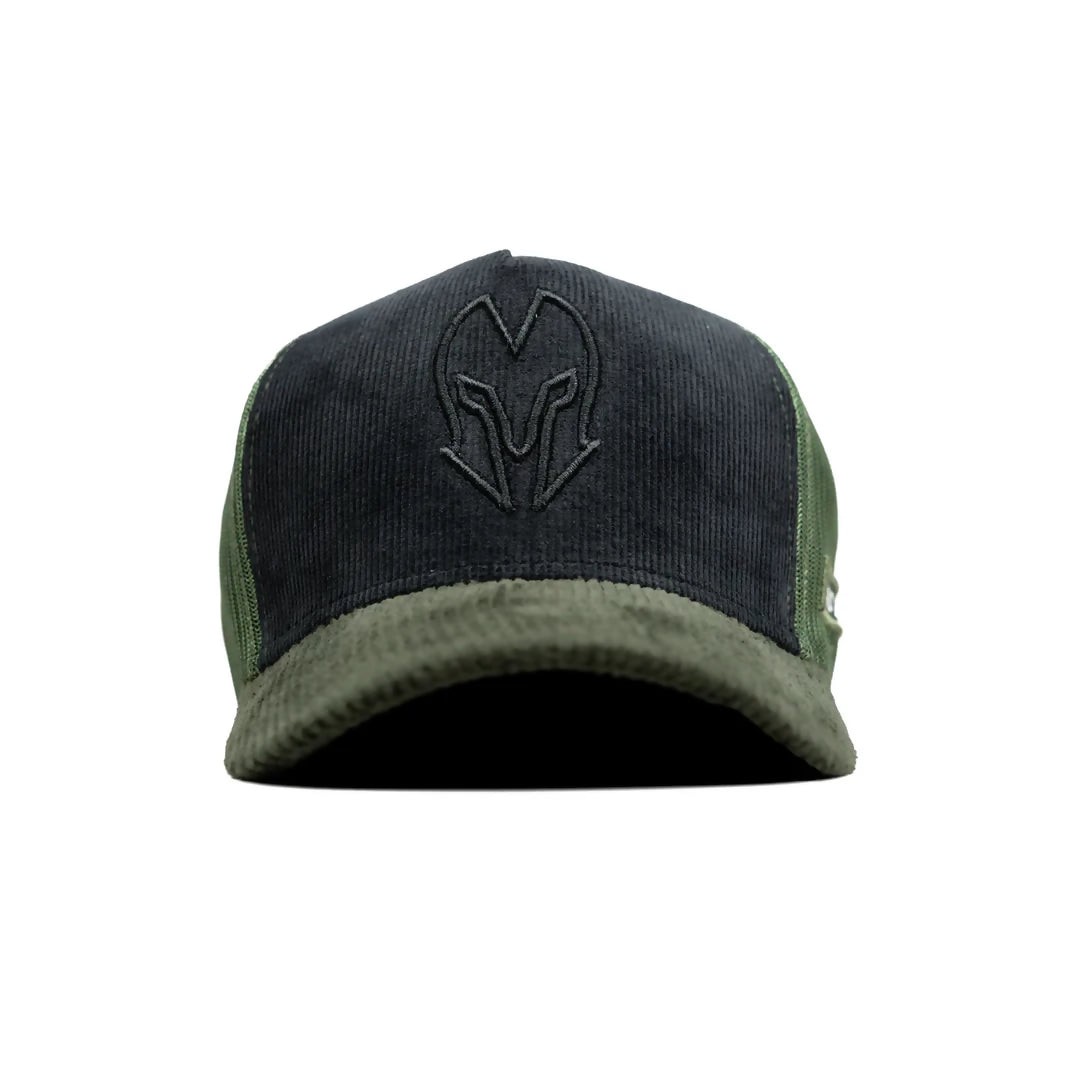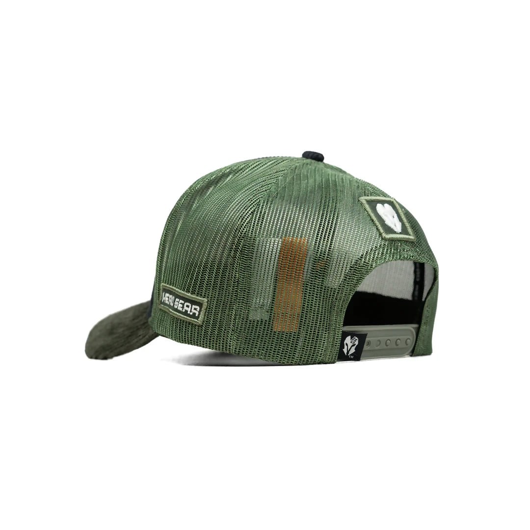 Introducing the Head Gear Black and Olive Dual Tone Trucker Cap, a standout piece from our Two-Tone Series. This cap combines sleek urban aesthetics with practical design, making it ideal for both the style-conscious and the outdoor enthusiasts. It features a sophisticated five-panel structure, with the front panel made from durable black cord fabric that provides a smooth and refined surface for the subtle Head Gear logo embroidered in black. The contrast is beautifully maintained by the olive-colored mesh on the back, enhancing breathability and adding a pop of color that complements the black front. The visor, also in olive-colored cord fabric, ties the look together and offers additional sun protection. A plastic snap closure at the back allows for easy adjustability, ensuring that one size fits most comfortably.